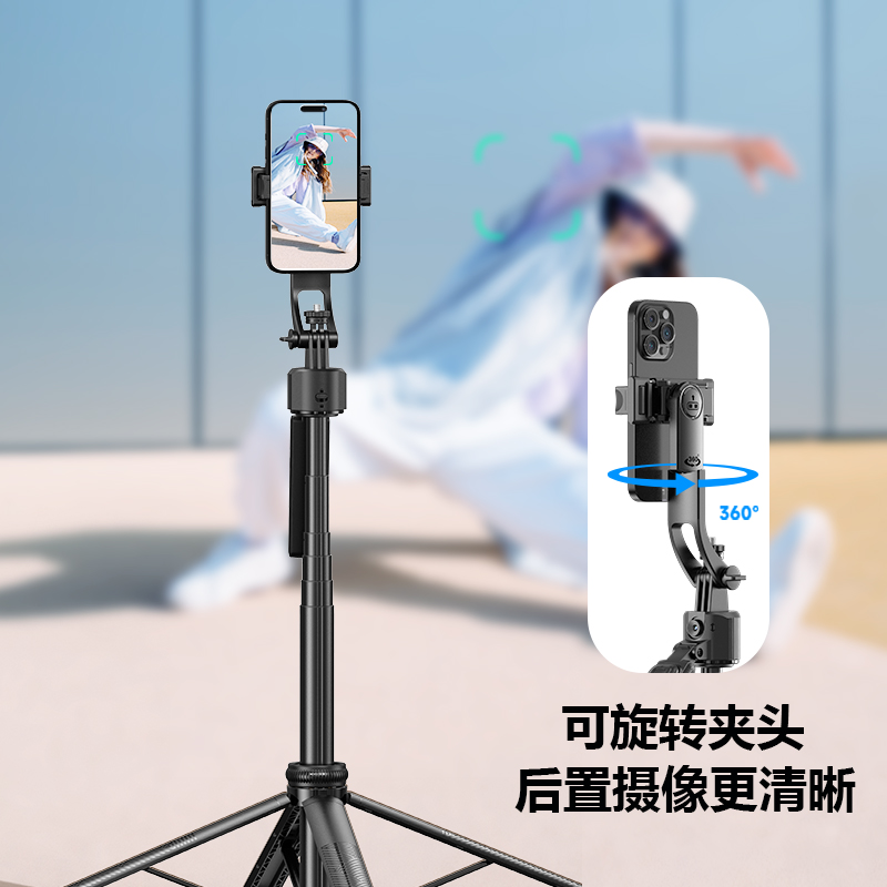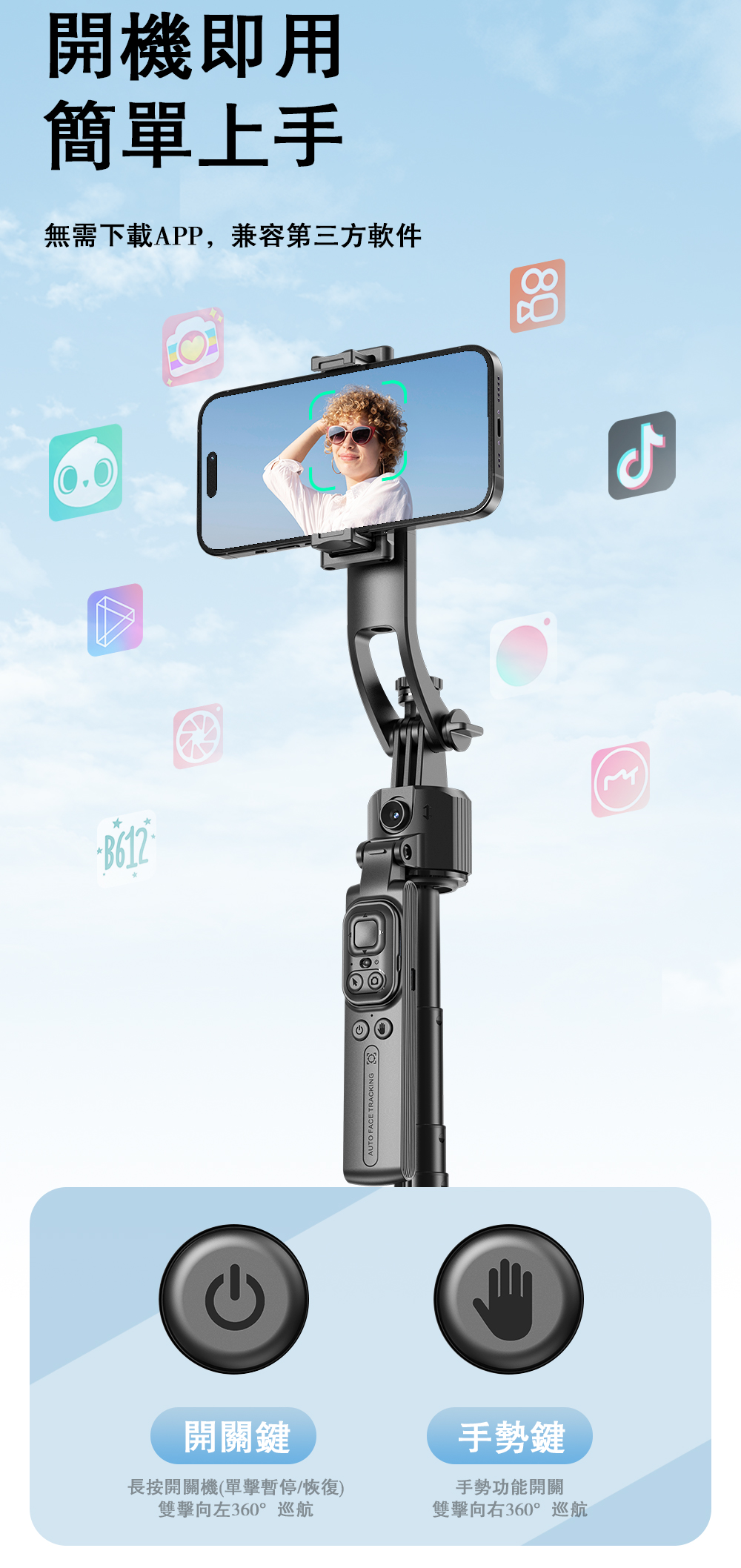 功能:內三角四腳架、旋轉鎖扣、雙手柄、1/4螺絲頭、360旋轉雲台、Ai人臉跟蹤、可拆卸夾頭