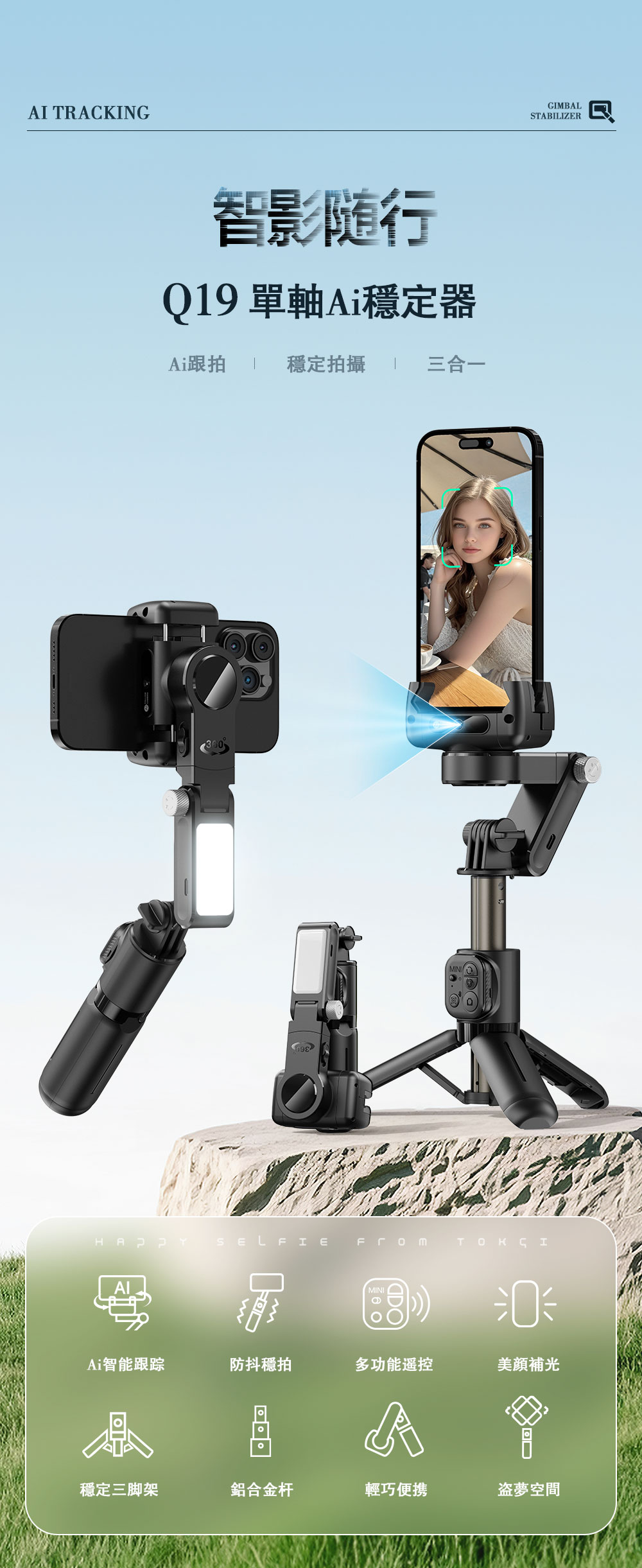 Q19穩定器 ,人臉跟蹤,智能防抖 ,單軸Ai穩定器