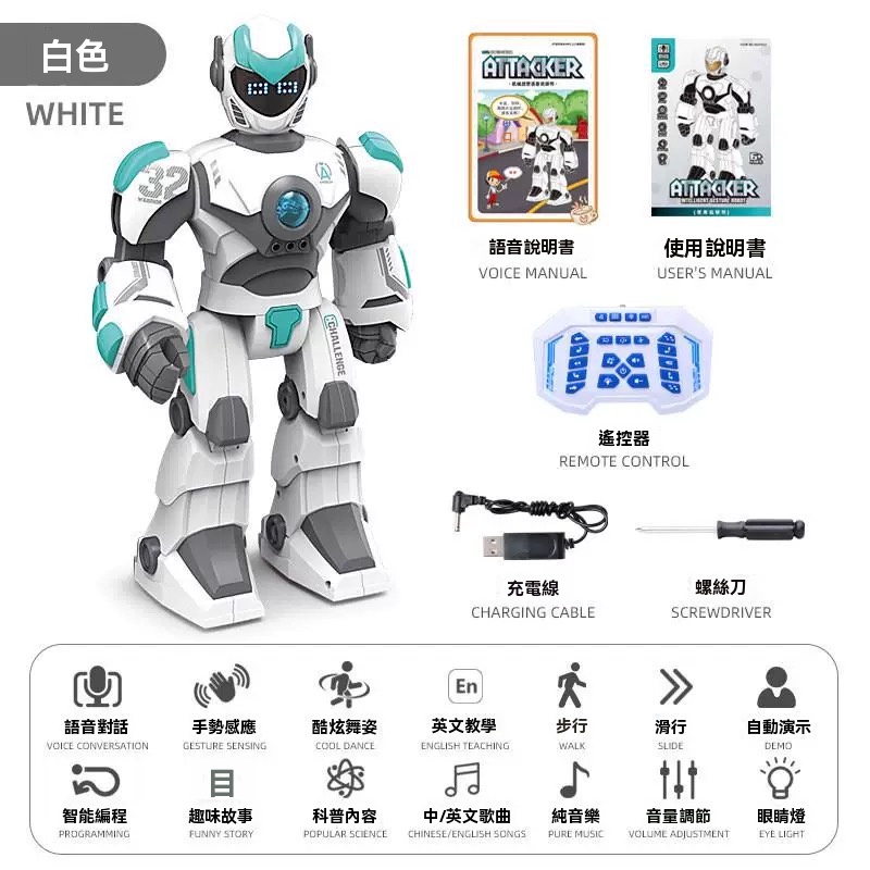 ★產品配置:機器人1只、遙控器1個、3.7V 3.5彎頭USB充電線1條、說明書1本、語音控制提示卡1套、螺絲刀1把